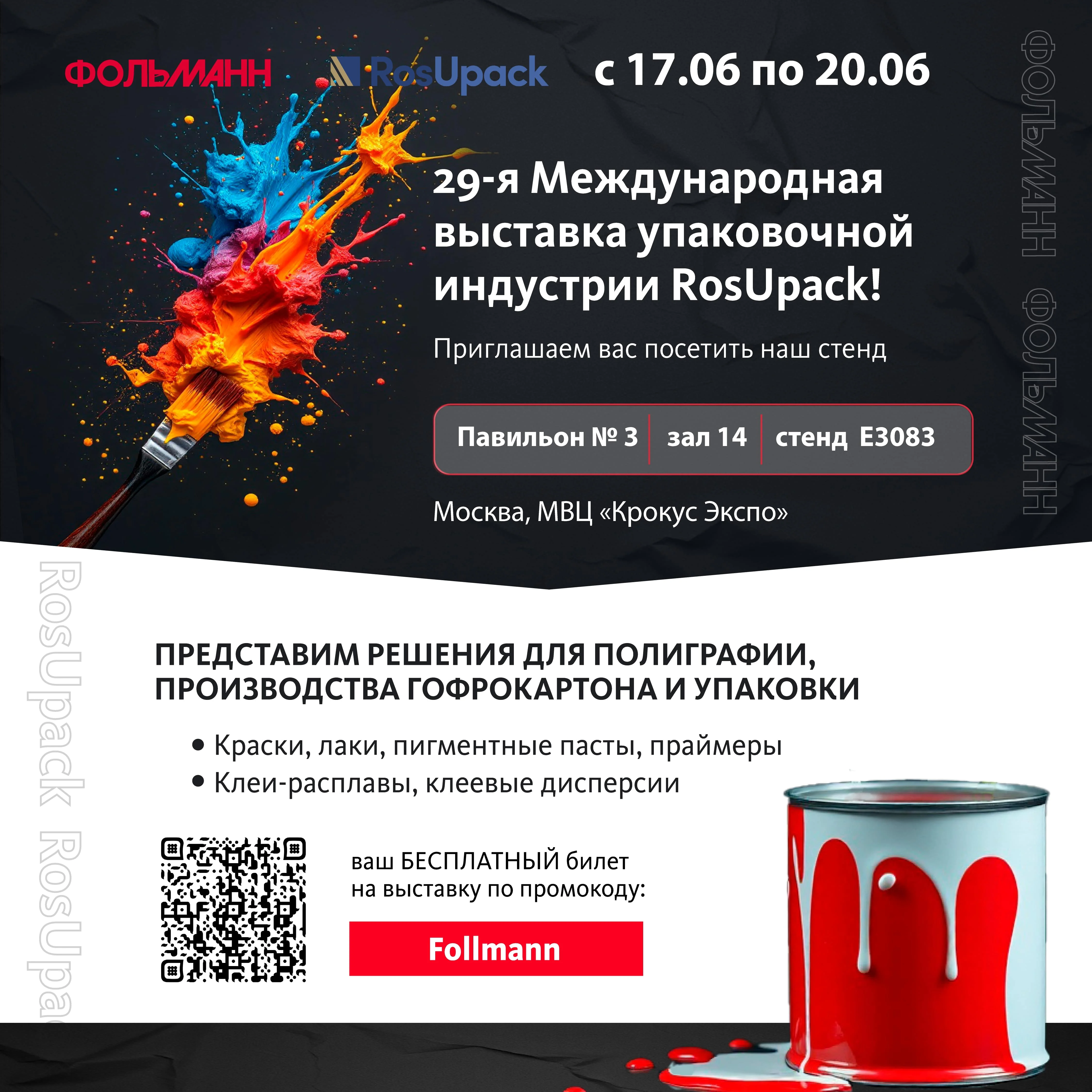 Компания «Фольманн» является почётным участником выставки и вы можете получить билет на выставку по специальному промокоду нашей компании Follmann , который необходимо указать при регистрации: https://rosupack.com/ru/visit/visitor-registration/
