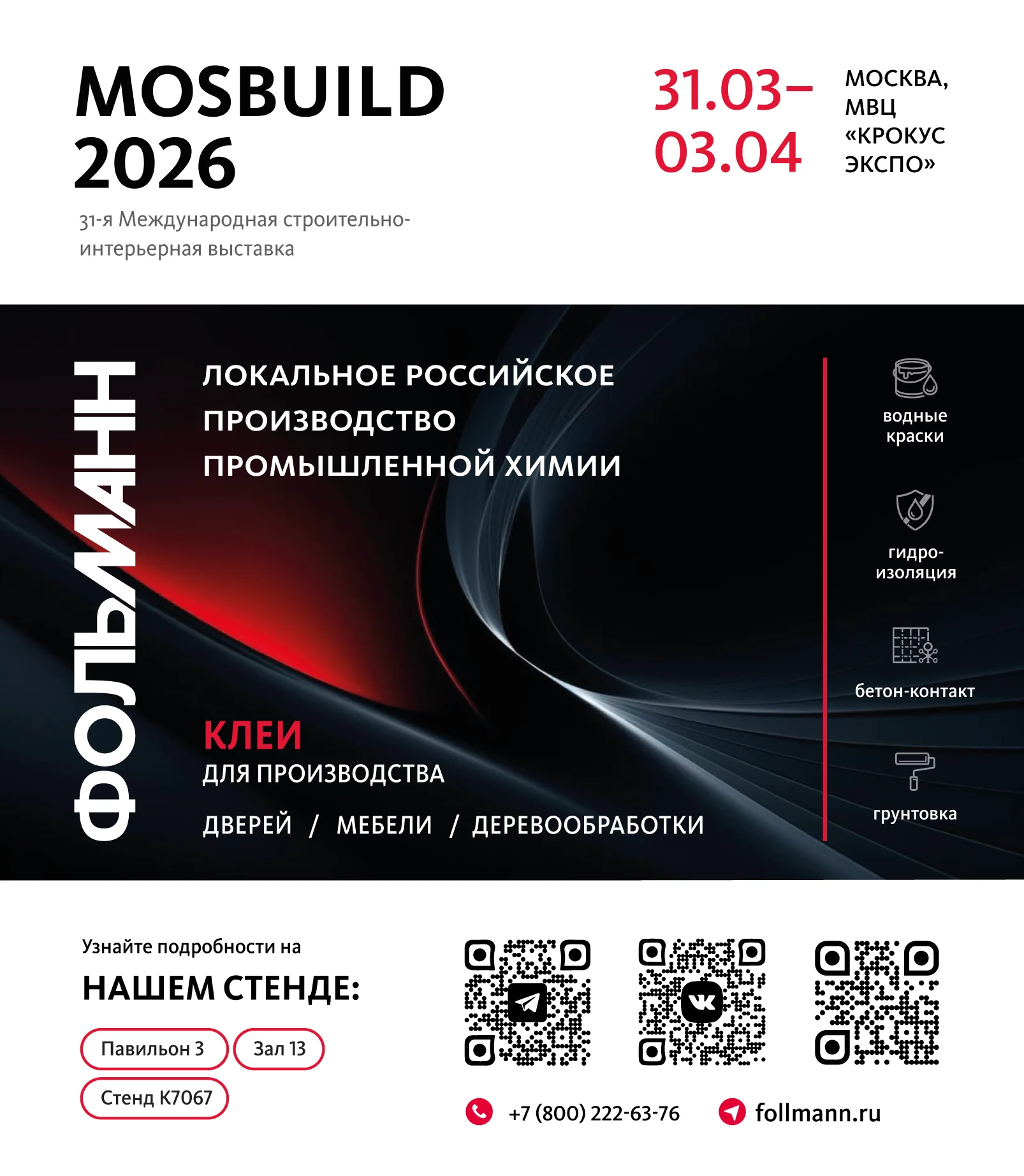 16 марта 2026Уважаемые коллеги! Компания «Фольманн» с радостью приглашает Вас посетить наш стенд на международной выставке «MosBuild 2026», которая пройдет с 31 марта по 03 апреля 2026 года в Москве, МВЦ «Крокус Экспо».